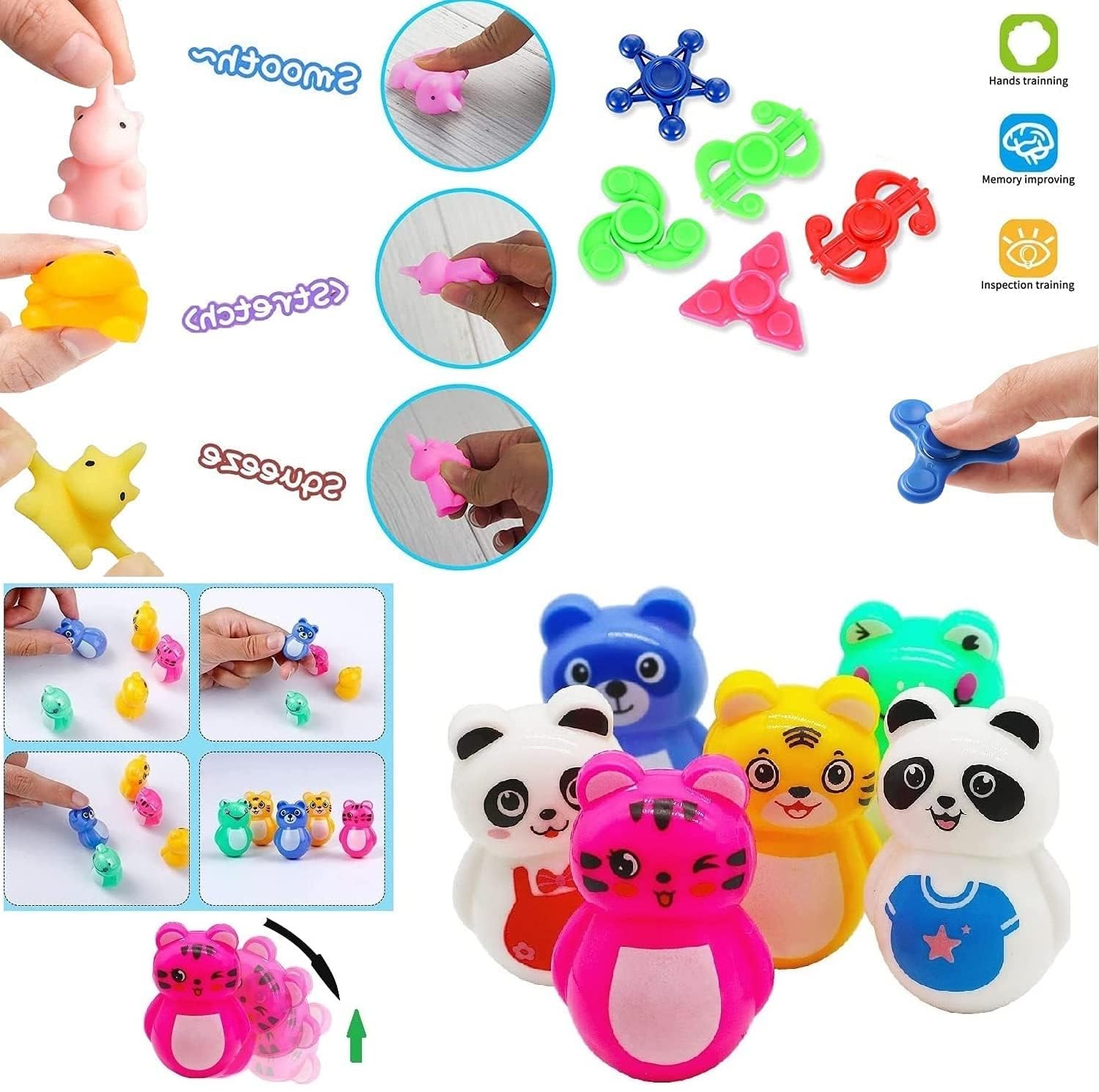 Includes slap bracelets, fidget spinners, maze puzzles, skateboards, pull-back cars, mochi squishies, and more