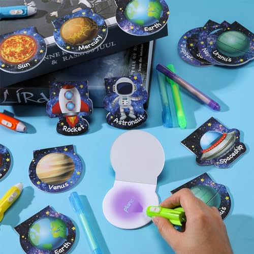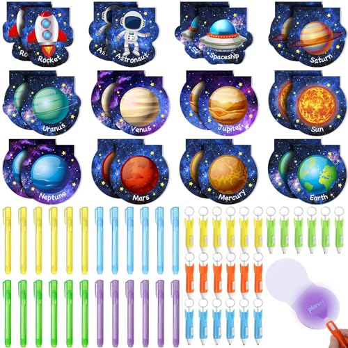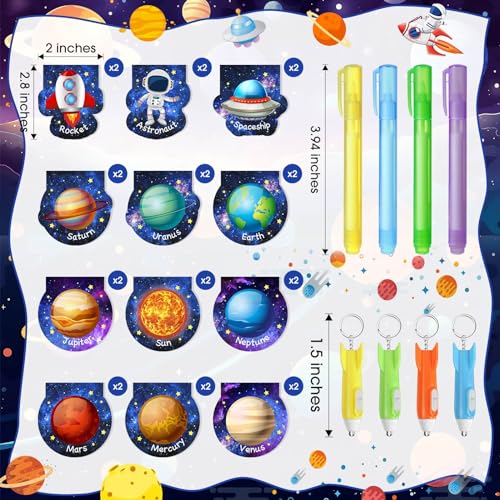 Bring interstellar excitement to your next party with this 72-piece favor set! Includes 24 invisible ink pens with built-in UV lights, 24 space-themed mini notebooks, and 24 spaceship flashlights. Perfect for goodie bags, pinata fillers, or spy-themed games. Safe, non-toxic, and designed to inspire curiosity, imagination, and a touch of cosmic mystery at birthdays or classroom events.