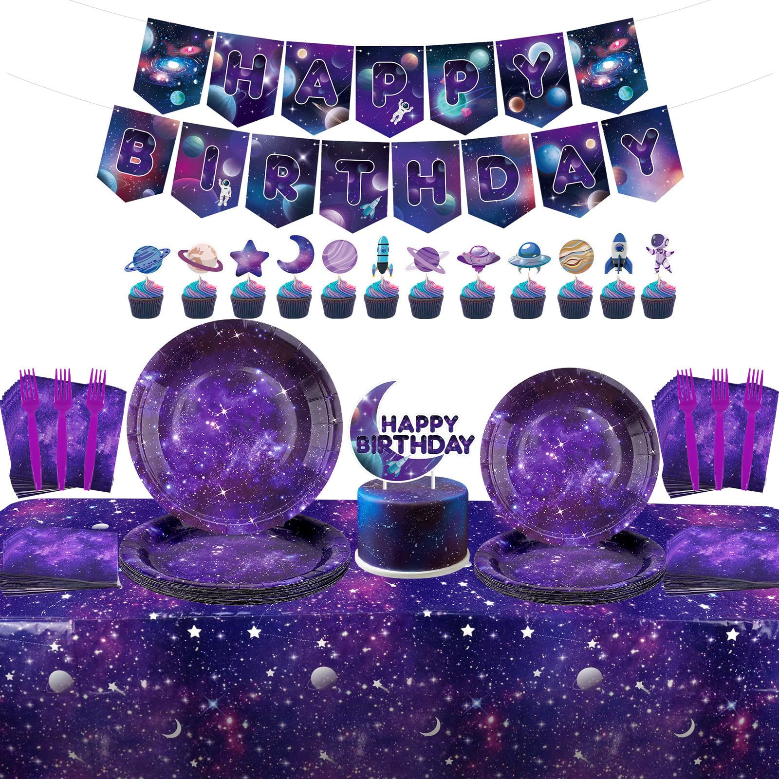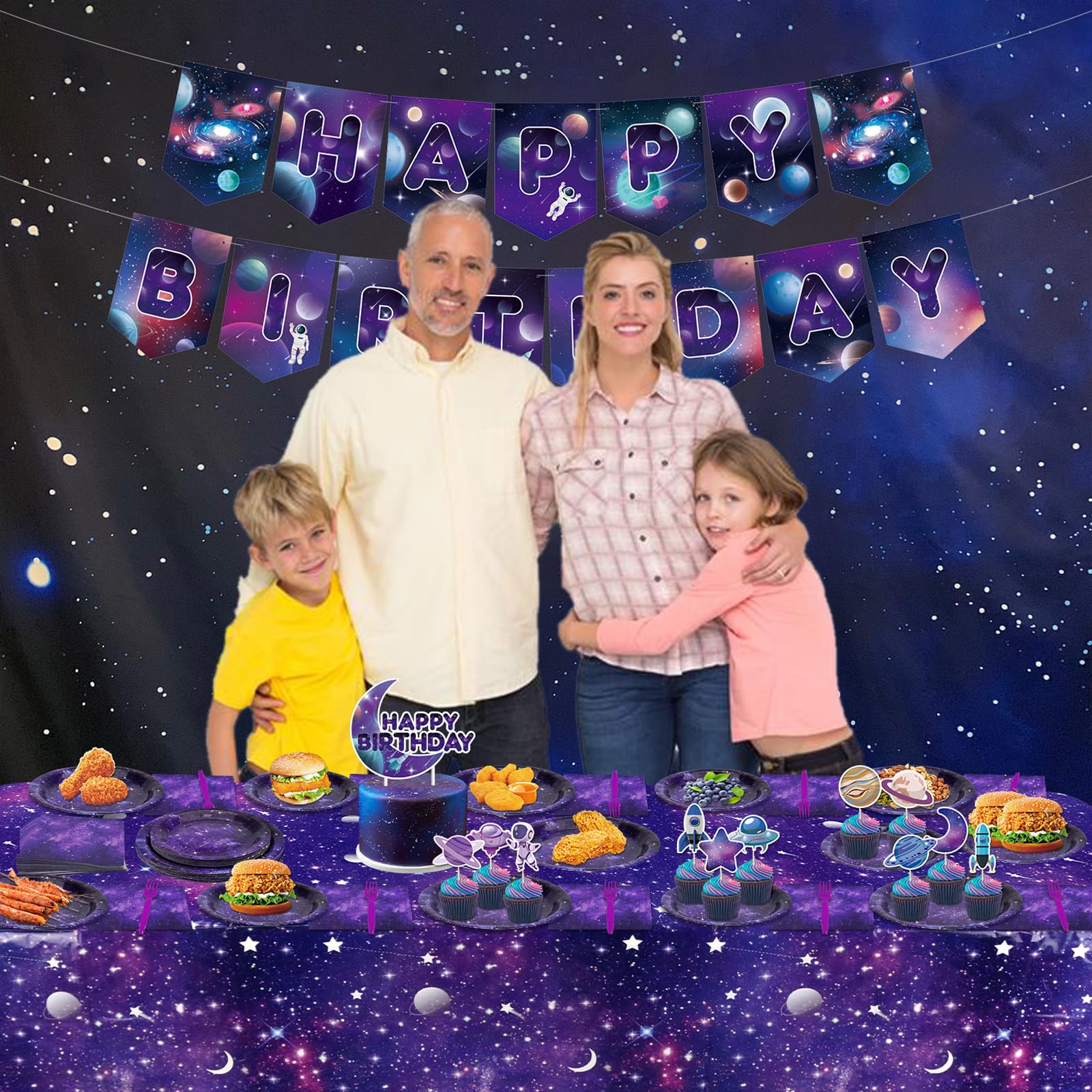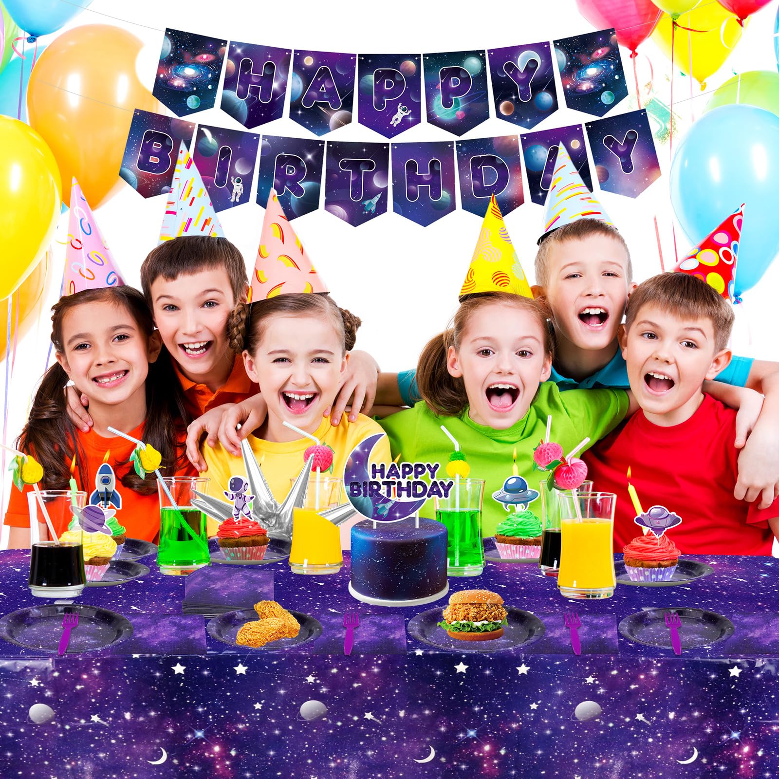 Space-themed birthday set with galaxy banner, balloons, and tableware