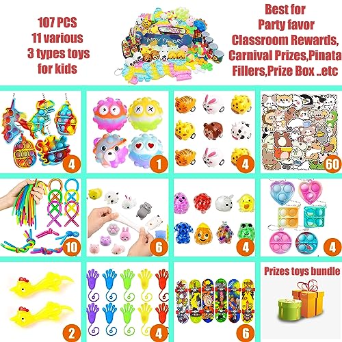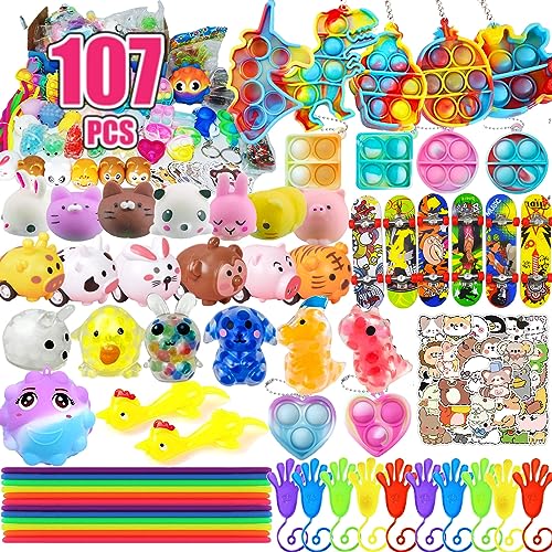 Get ready to upgrade your party game with this 107-piece collection of mini fidget toys, pop-its, squeeze dinos, animal cars, stickers, and more. These toys are handpicked for fun, sensory stimulation, and the βwowβ factor.