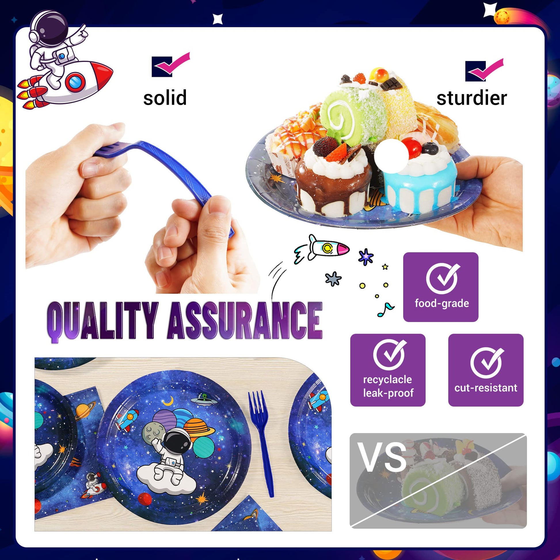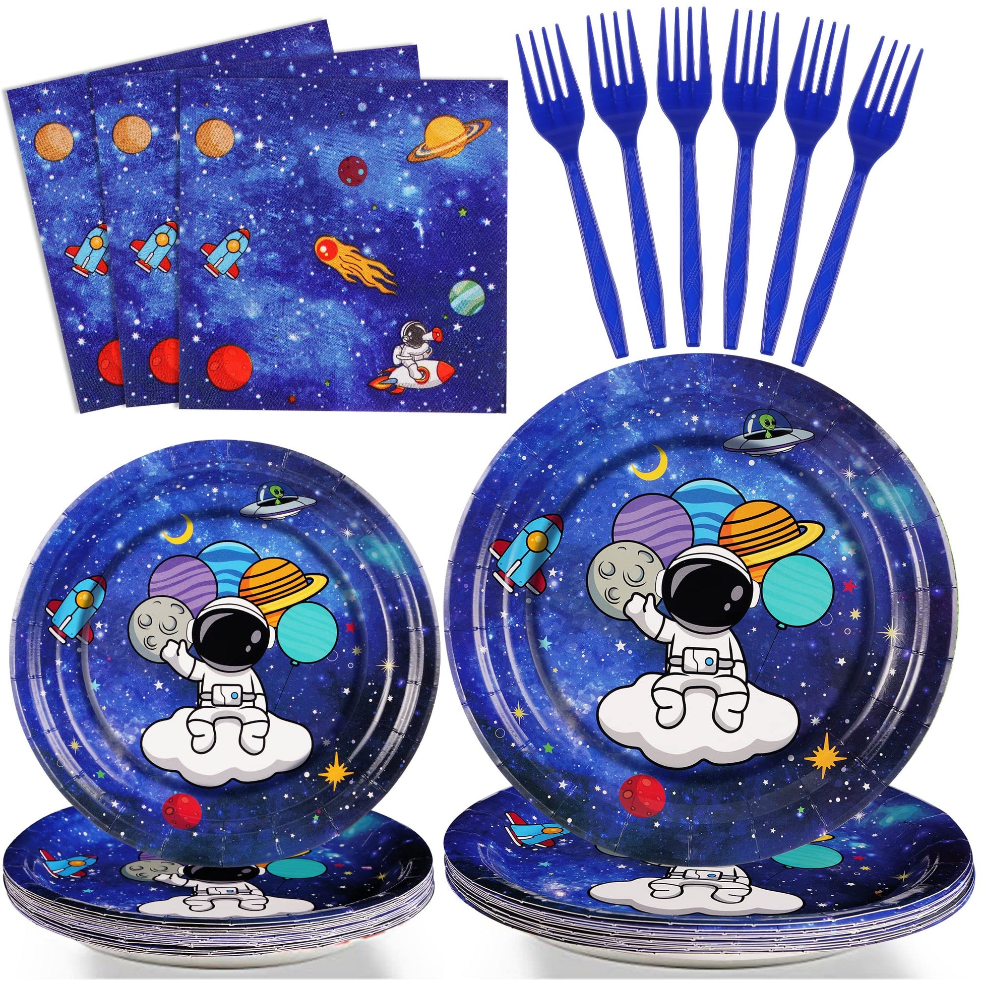 Host an unforgettable galaxy-themed celebration with this 96-piece space party set! Designed for 24 guests, this bundle includes everything you need: 9” and 7” plates, napkins, and sturdy blue plastic forks. The vibrant space-themed design features astronauts and planets to delight young space explorers. Made from high-quality, food-safe materials and disposable for easy cleanup—perfect for birthdays, classroom parties, or science-themed events.